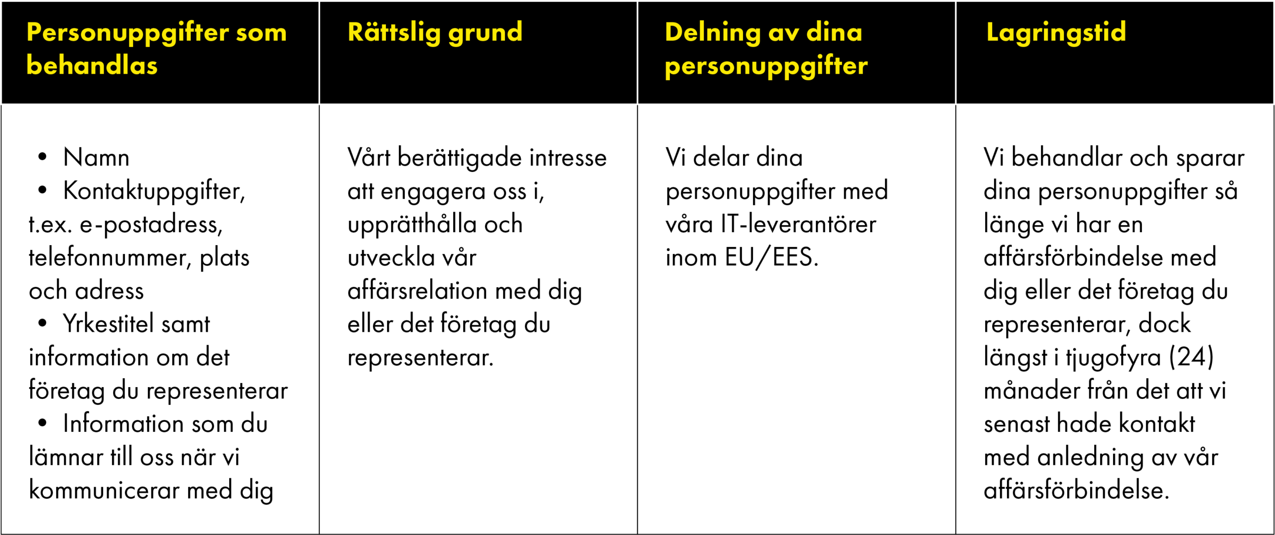 För att upprätthålla och utveckla vår affärsrelation med dig eller det företag du representerar kommer vi att kontakta och kommunicera med dig som kontaktperson för någon av våra befintliga eller potentiella kunder, partners, leverantörer eller affärskontakter i allmänhet.