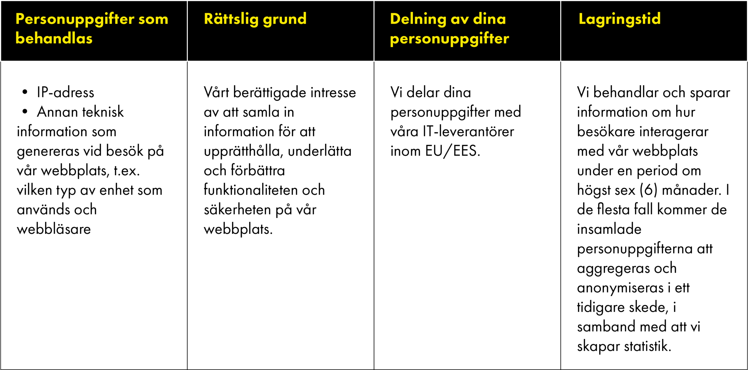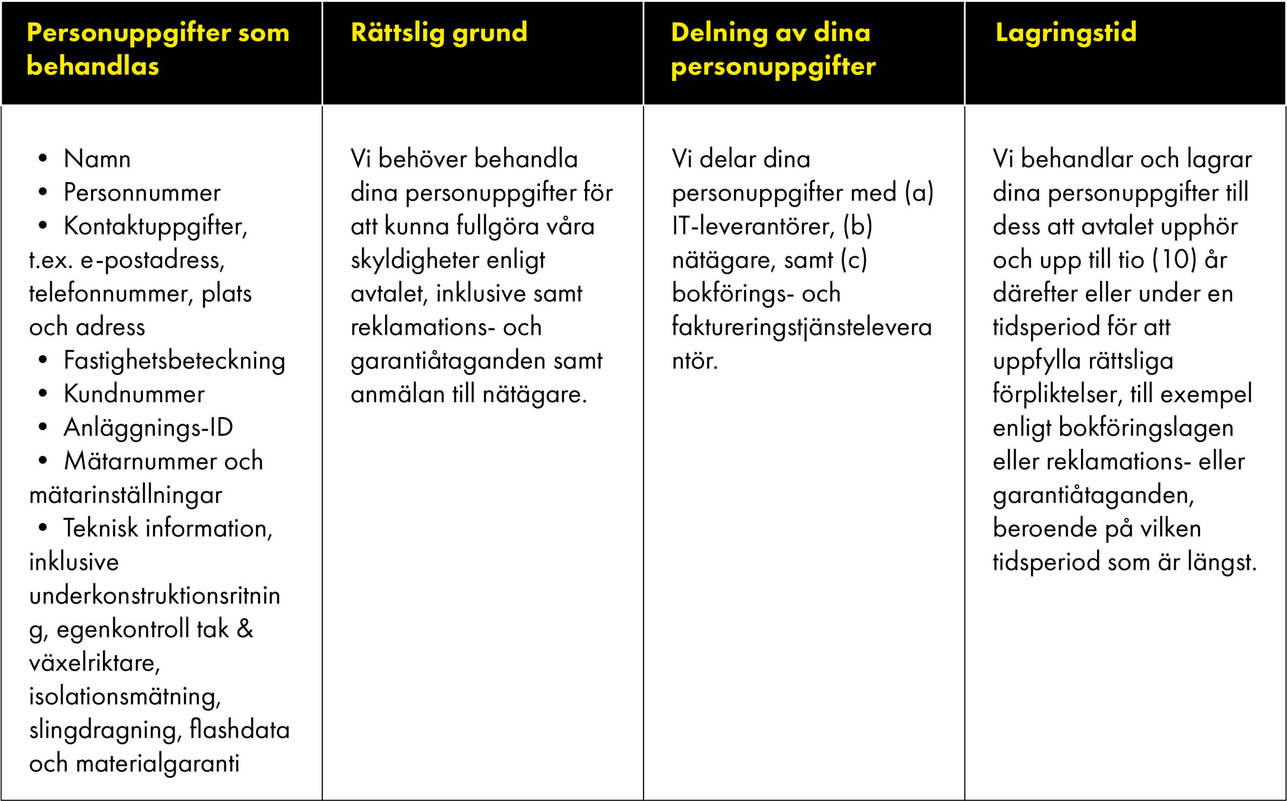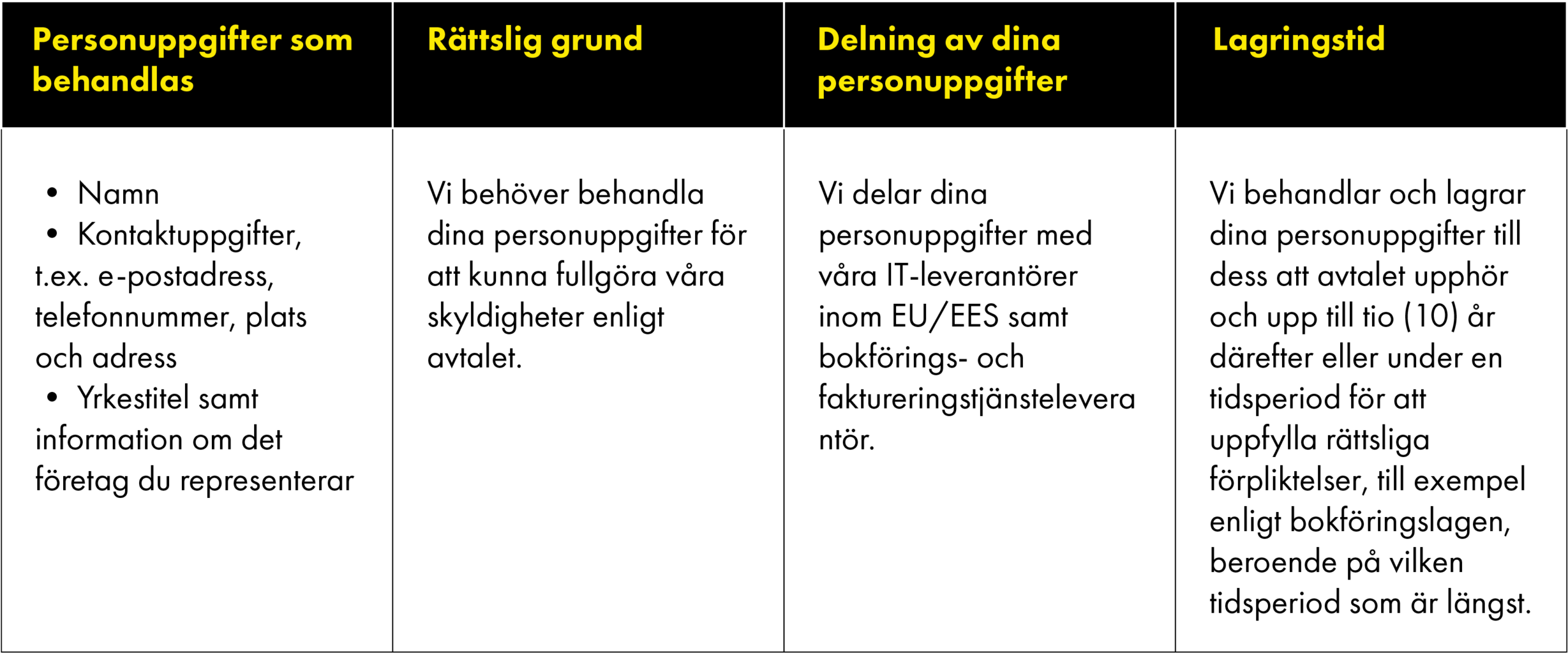 Nedan förklarar vi mer om de kategorier av personuppgifter som vi behandlar, för vilka ändamål vi behandlar dem och vilka rättsliga grunder vi förlitar oss på när vi behandlar dina personuppgifter, inklusive hur länge vi lagrar dina personuppgifter.