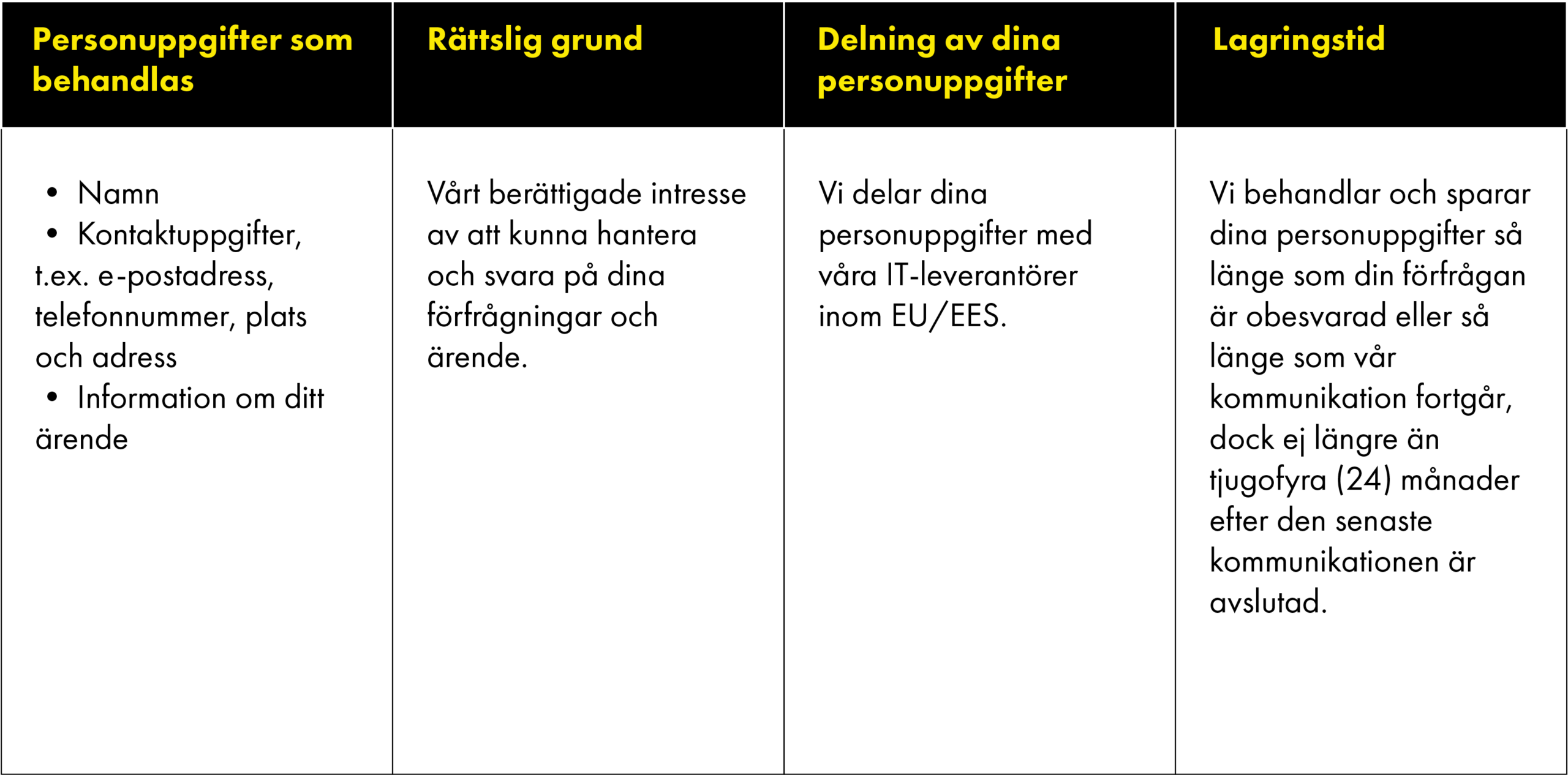 Samtycke: behandlingen sker med ditt samtycke, där vi ansvarar för att tydligt informera dig om vilken behandling du samtycker till och din rätt att återkalla ditt samtycke i förhållande till vår fortsatta behandling.
