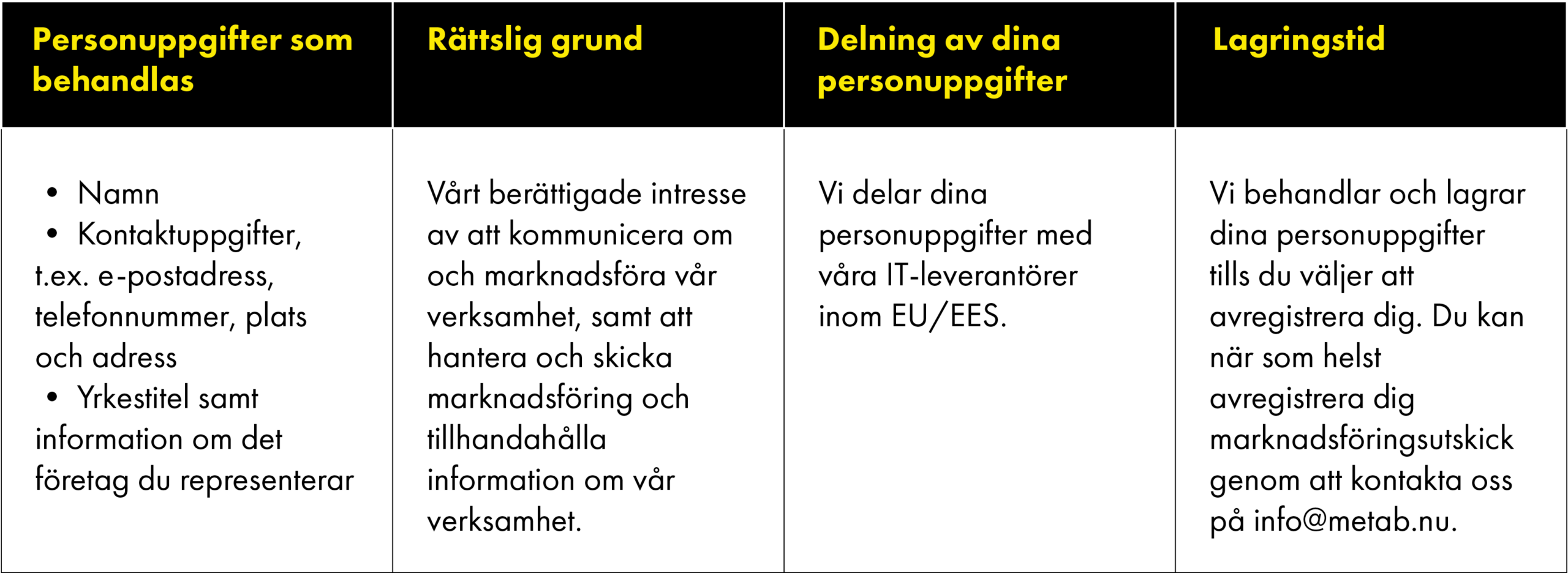 METAB är, i egenskap av personuppgiftsansvarig, ansvarig för behandlingen av dina personuppgifter enligt vad som beskrivs i denna Policy. Om du vill veta mer om vår behandling av dina personuppgifter är du välkommen att kontakta oss via e-post info@metab.nu.