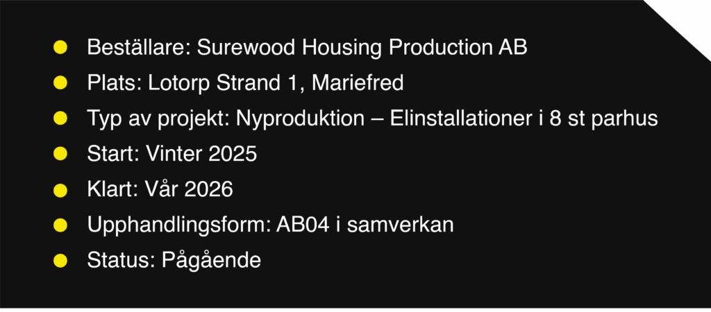 Uppdraget genomförs i samarbete med Surewood Housing Production AB, som är byggherre för projektet. Tillsammans med montörsteamet och projektets övriga aktörer ser vi fram emot att färdigställa elinstallationerna i de åtta nya parhusen, redo för inflyttning i mars 2026.